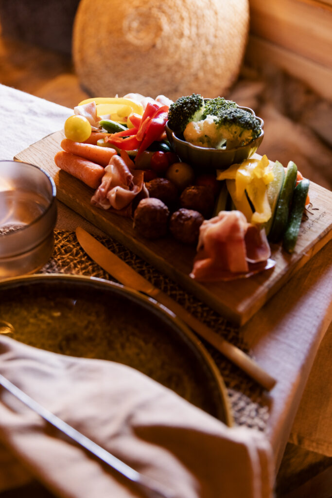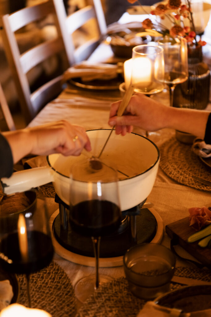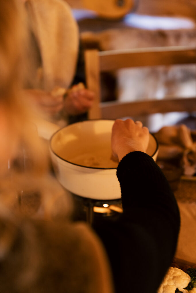 We serveren een rijke, romige kaasfondue gemaakt van een mix van smaakvolle kazen. Daarbij krijg je een tafel vol brood, charcuterie (vegetarisch uiteraard ook mogelijk), groentes en andere lekkere dippers om heerlijk mee te fonduen. Niets ingewikkelds, gewoon lekker eten in een fijne setting.