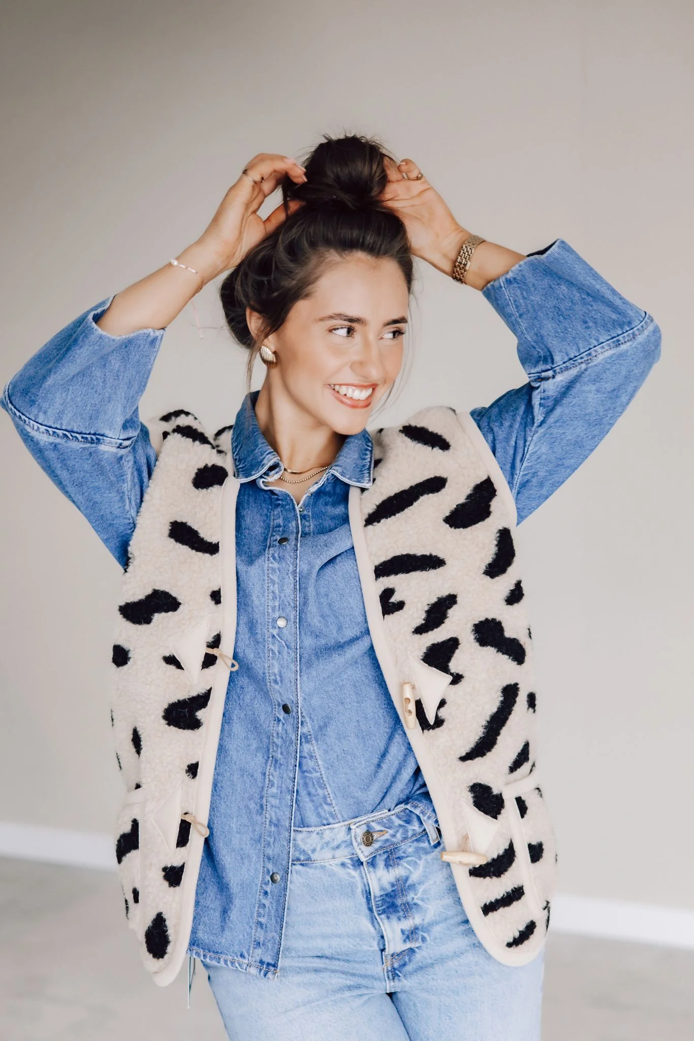 Alwero bodywarmer Alpen Adult Gepard. Deze bodywarmer heeft een unieke print en een houtje touwtje sluiting, is gemaakt van 100% wol en is niet gevoerd. Wil je de bodywarmer een beetje oversized dragen, kies dan voor een maatje groter dan je standaard maat.