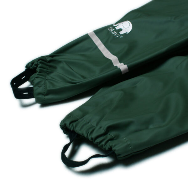 Durable PU rain pants available either as overalls with adjustable elastic suspenders (size 70-100) or with elastic waistband (size 110-140). Size 70-100 has elephant and CeLaVi logo on the right leg whereas size 110 and up only has CeLaVi logo. The pants have a reflective stripe on the right leg, so that the child is always visible. Available in many colors that match CeLaVi’s raincoats. The pants are like all our rainwear made of a great material that is both lightweight and durable. Even when it’s raining heavily, the child can stay dry, as the rainwear can hold a water pressure of 5000 mm. The seams are wind and waterproof